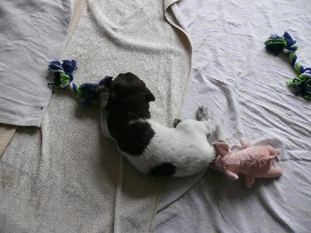Noch keine 3 Wochen alt und schon ne Wildschweinkeule im Maul ;-)